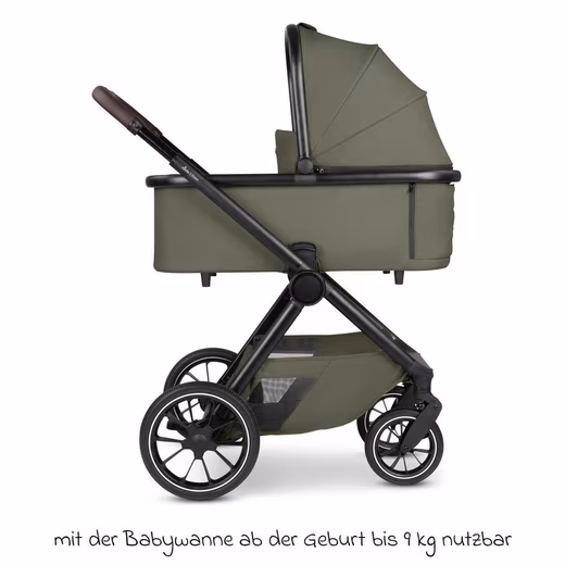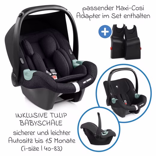 - Travel system with infant car seat: Includes Tulip infant car seat (i-Size standard), side impact protection & newborn insert – can be attached directly to the frame with the included adapters.