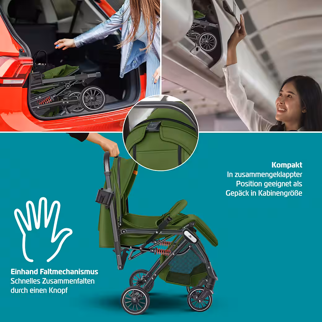 • Our children’s buggy makes everyday life effortless. The innovative one-hand folding mechanism allows for quick and easy folding with a single movement.
