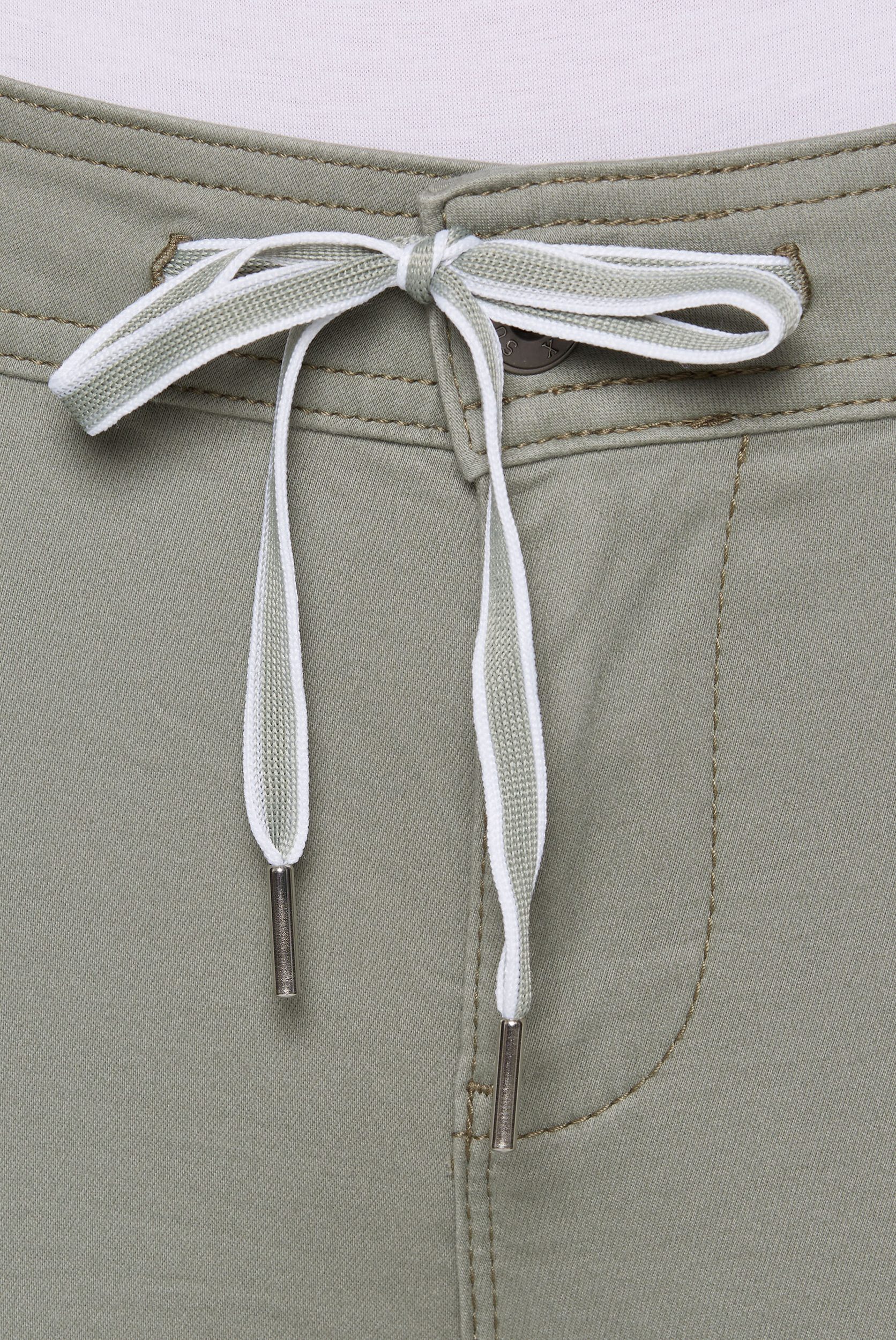 • Waistband with button, zipper and drawstring