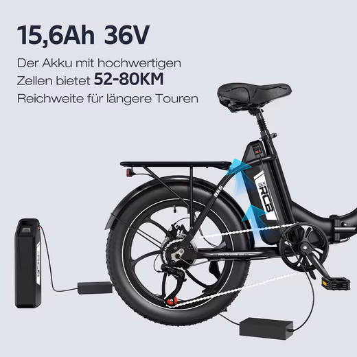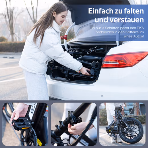 [Compact Design] The RK6 foldable pedelec for adults can be easily unfolded or folded in just 10 seconds. With a compact folding size of only 880 mm × 500 mm × 740 mm, it is ideal for on the go – whether in the trunk, in the apartment or hung up to save space. Perfect for commuters and city trips!