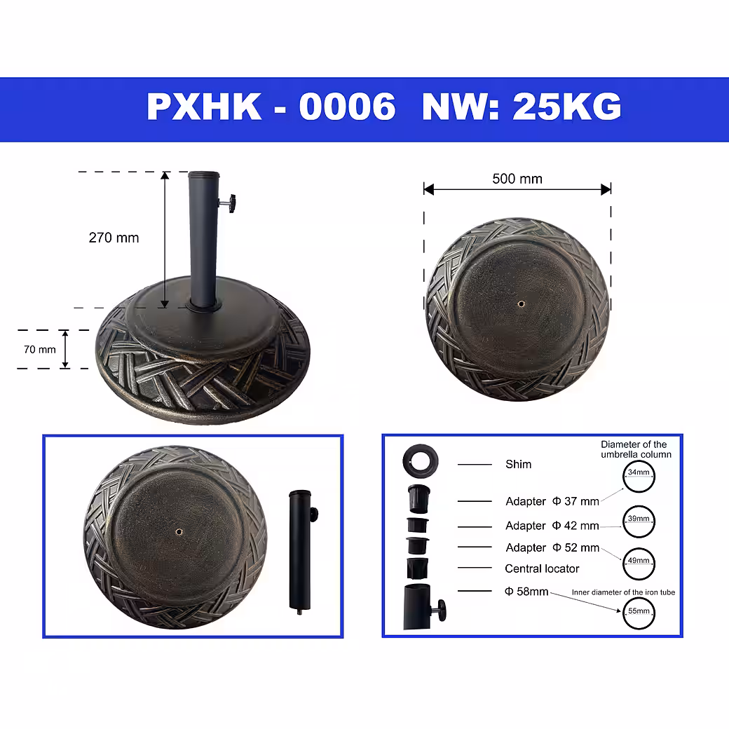 The package includes three adapter rings suitable for parasol poles with diameters of 34, 39, and 49 mm. Without these adapters, the stand can also securely hold parasol poles with a diameter of up to 55 mm. Simply select the appropriate adapter for your parasol, insert it, and secure it with the screw.