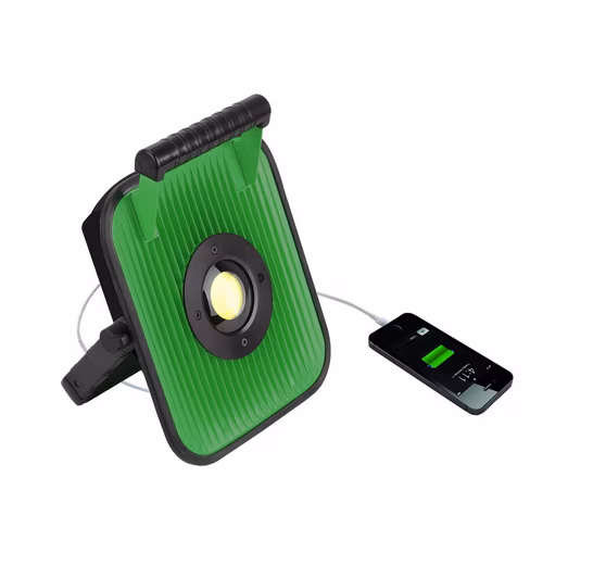“The 30-watt LED work light is ideal for optimal mobile illumination of your workspace. Whether on the construction site or around the house and garden, you can conveniently play music (MP3s) or internet radio on the LED light while working. The built-in USB port allows you to charge mobile devices on the go. The brightness is dimmable in two stages: 50% and 100%. It’s easy to use, cordless, portable, and can be used anywhere thanks to its continuously adjustable stand. By using an additional battery, you can extend the operating time to up to 10 hours.”