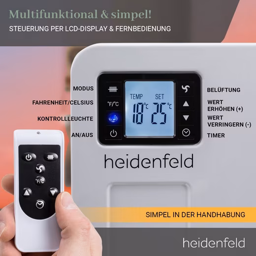 To ensure that you always have all parameters in view, the Heidenfeld EK100 convector heater comes with an LCD display. For example, you can read the current and desired temperature or the set heating level.