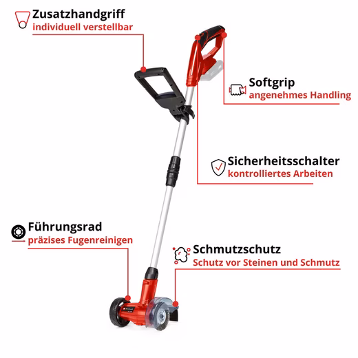 The Einhell Cordless Grout Cleaner GC-CC 18 Li Solo is a practical tool for visually enhancing the garden and extending the service life of the surface. The cordless grout cleaner is easy to use and effective in its results. The brushes are interchangeable, a nylon brush and a steel brush are included. The infinitely telescopic handlebar allows work to be done while standing, a position that relieves the back and protects the knees. The infinitely adjustable second handle and the guide wheel support easy handling and targeted cleaning. The soft grip ensures a pleasant working feeling, even during persistent cleaning work. The cordless grout cleaner is a member of the Power X-Change family, the new lithium-ion technology from Einhell. All system batteries of the Power X-Change series can be used with the cordless grout cleaner. Supplied without battery and without charger.