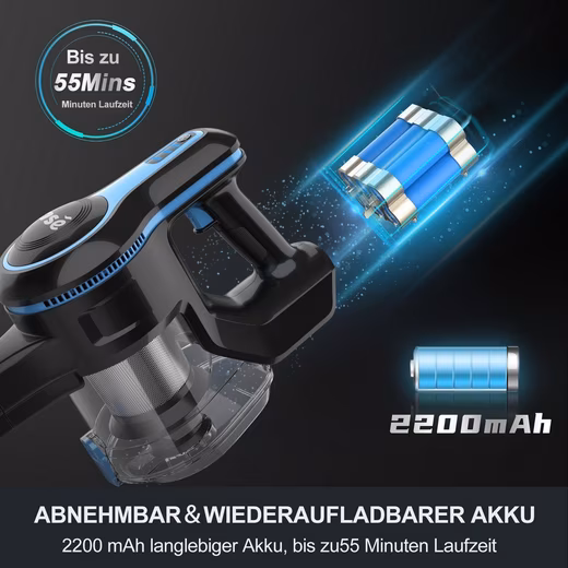 This cordless vacuum cleaner contains a replaceable 2200mAh Li-ion battery. The battery is removable and can be charged separately, it can also be charged on the cordless vacuum cleaner.