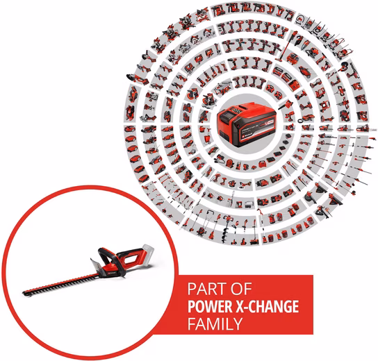 The Einhell GC-CH 18/40 Li Solo cordless hedge trimmer combines power and flexibility: As a member of the Power X-Change family from Einhell, the hedge trimmer is powered by one of the powerful lithium-ion batteries in the series. The small, handy hedge trimmer is a true “lightweight” and comfortable to handle due to its low weight. The robust metal gear is designed for a long service life and ensures the perfect conversion of the battery power to the laser-cut and diamond-ground steel blades. A 2-hand safety switch protects the user during operation. The scope of delivery includes an aluminium blade cover to protect the knives as well as a shock protection with bracket for wall mounting and a sturdy quiver for storage and transport. The batteries of the high-quality Power X-Change series can be combined with all system tools without limits. To operate the cordless hedge trimmer, 1x 18V battery is required. The delivery is made with the 18V 2.5Ah PXC Starter Kit.