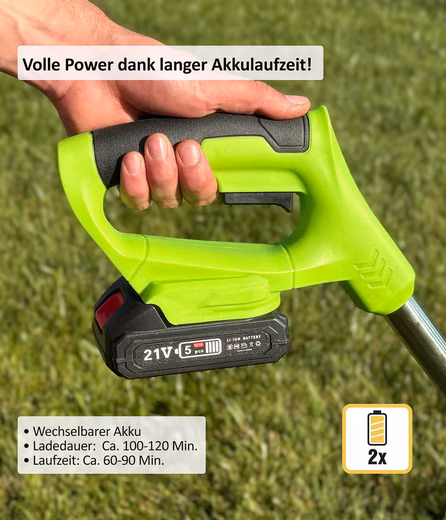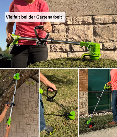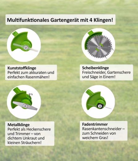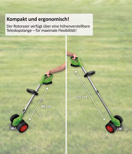 With the Rotorazer 8in1 garden tool, these problems are a thing of the past. The battery-powered, cordless garden tool combines 8 functions in one: lawn mowing, trimming, clearing, cutting lawn edges, trimming hedges, cutting branches, sawing wood and even weeding. Garden maintenance has never been so easy and fast! Thanks to the simple conversion from lawn mower to trimmer – you only have to remove the wheels – you have a flexible, versatile tool that delivers flawless results in the shortest possible time. The Rotorazer 8in1 offers you everything you need for efficient garden maintenance.