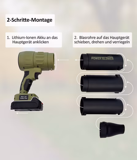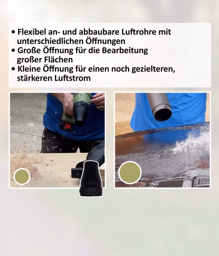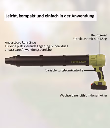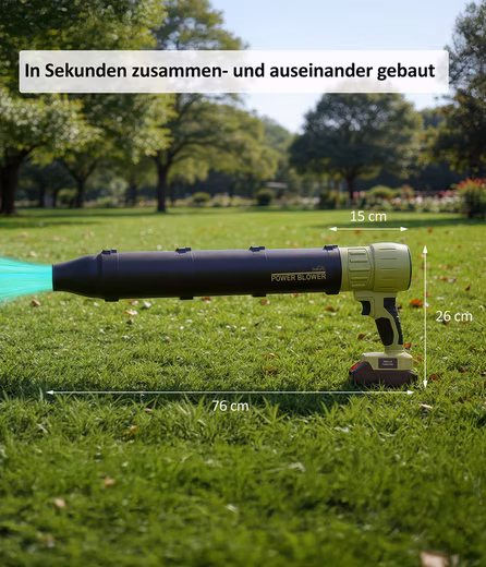 Power Blower Cordless Leaf Blower – a new generation of garden care The Power Blower Cordless Leaf Blower stands for a new generation of garden care. It combines powerful performance with exceptional manoeuvrability. Designed for demanding users who value efficiency, flexibility and convenience, this portable, cordless leaf blower offers an impressive combination of performance, precision and versatility. Whether in the garden, around the house or in the workshop – the Power Blower is used wherever cleanliness is required quickly and thoroughly. Powerful yet ultra-light With a weight of less than 1.5 kilograms, it is one of the lightest cordless leaf blowers in its class. The lightness enables particularly comfortable, one-handed operation, even during longer uses. Despite its compact design, the handheld leaf blower achieves an impressive airflow speed of up to 120 km/h. This means that even stubborn dirt such as wet leaves, fine dust, snow, gravel or water can be removed effortlessly – without any physical exertion. Cordless and intelligent – technology for maximum control The Power Blower is much more than a classic cordless garden blower. One-handed operation ensures a high level of ease of use, while the replaceable lithium-ion battery allows flexible operating times. Thanks to air pipes of different sizes that can be flexibly mounted, the air flow can be used over a large area or with pinpoint accuracy – depending on the requirements. Stepless regulation also allows gentle use in sensitive areas such as flower beds. Whether on meadows, paths, in beds and hedges, on garden furniture, ventilation filters, rain gutters, vehicles, in workshops or on drains – this compact cordless leaf blower shows its strengths everywhere. Even hard-to-reach corners and angled areas can be easily cleaned with the precisely controllable airflow. Design meets functionality In addition to its technical features, the Power Blower impresses with its ergonomic design. Thanks to its compact shape, low weight and intuitive operation, it is the ideal companion for private use. The high-quality workmanship ensures durability and reliability – even with regular use under demanding conditions. A device that sets standards With the Power Blower, cleaning around the house, in the garden or in the workshop is not only easier, but also much more efficient. The combination of strong performance, cordless application and convenient handling makes it an indispensable tool for all those who value cleanliness, order and time savings. Experience a lightweight cordless leaf blower that combines performance, comfort and versatility in perfect balance and changes your cleaning routine for good.