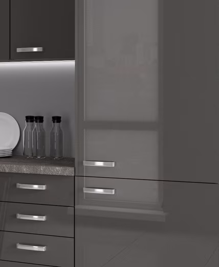 Front material: Chipboard + foil in high-gloss grey, thick edges grey gloss
