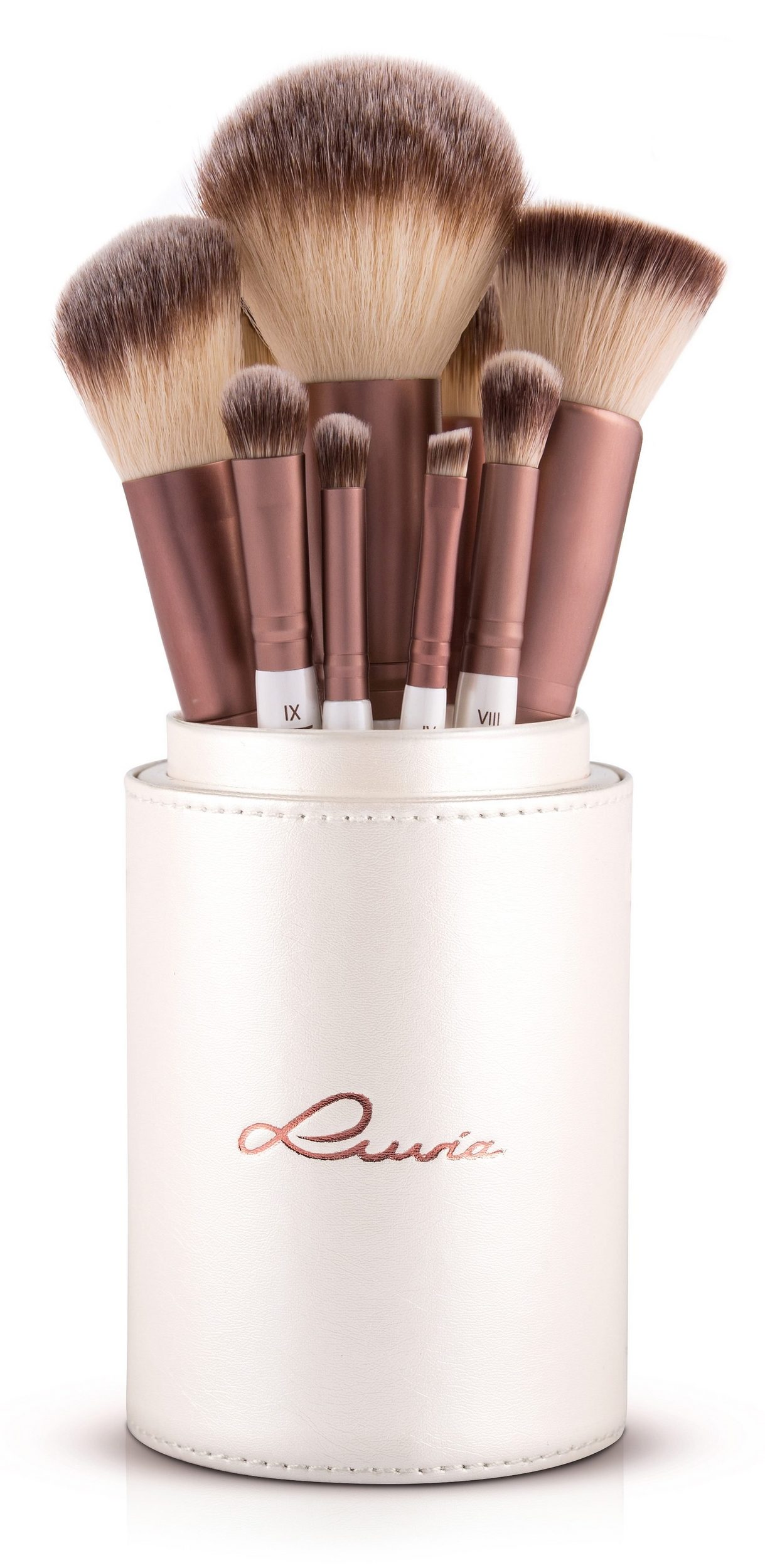 “Prime Vegan” by Luvia Cosmetics is a particularly high-quality and 100% vegan brush set that covers the entire spectrum of aesthetic demands: 15 different brushes, each a stunning specialist in its own right, promise first-class cosmetic results. From precise accents to a flawless finish, this set allows you to create breathtaking makeup that sets standards. This is not only ensured by the high quality of the cosmetic brushes, but above all by the exclusive and innovative Nurai brush hair – the result of cutting-edge research that optimally absorbs and releases the used consistency. The brush set is also a true gem in terms of appearance: the 15 brushes come in an elegant yet decorative brush holder, entirely in elegant mother-of-pearl white. The brushes follow this sophisticated, trendy design with a mother-of-pearl white high-gloss handle and coffee-brown aluminum ferrule. A color combination that perfectly showcases feminine class. The set also includes an elegant satin brush pouch—ideal for stylish travel. Whether it’s an eyebrow, lip, or concealer brush, or a contour shader, powder, or blush brush, “Prime Vegan” is a revelation when it comes to makeup art. Its handling, design, and high product quality make it the perfect match.