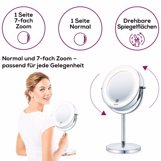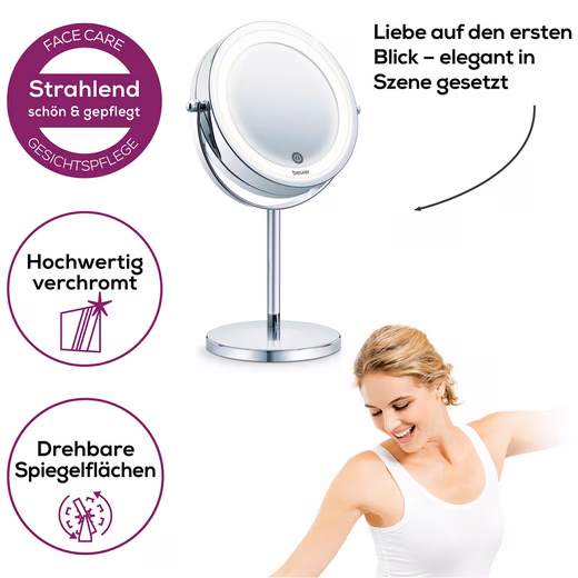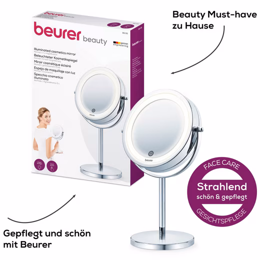 With the illuminated and rotatable BS 55 cosmetic mirror from Beurer, you can improve your daily facial care. Due to a two-sided round mirror surface, it can be used for both a normal and an enlarged view. The angle of inclination of the mirror surface can be selected individually. The light intensity of the large standing mirror can be infinitely adjusted. With an elegant and timeless design, the high-quality mirror fits into any modern bathroom.
