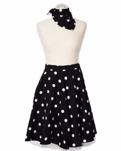 This super pretty 50s-style skirt with white polka dots is not only perfect for Mardi Gras, theme parties, or carnivals, but also makes a great summer outfit. The polka-dotted circle skirt is easily adjustable at the waist thanks to three decorative buttons, so it fits almost all children’s sizes or can be adjusted by moving a button. This great retro summer skirt with a chic scarf can also be worn with a 50s-style outfit. The rockabilly skirts are also perfect for show dance groups!