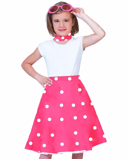 This super pretty 50s-style skirt with white polka dots is not only perfect for Mardi Gras, theme parties, or carnivals, but also makes a great summer outfit. The polka-dotted circle skirt is easily adjustable at the waist thanks to three decorative buttons, so it fits almost all children’s sizes or can be adjusted by moving a button. This great retro summer skirt with a chic scarf can also be worn with a 50s-style outfit. The rockabilly skirts are also perfect for show dance groups!