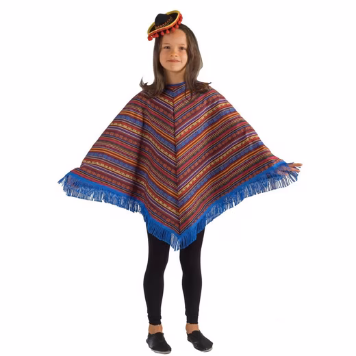 High-quality, colorful poncho for girls and boys for carnival or school plays. The colorful poncho features a blue fringe trim. The colorful wrap is 66 centimeters long and suitable for girls and boys. Suitable for ages approximately 6-9! High-quality workmanship. Made in the EU!