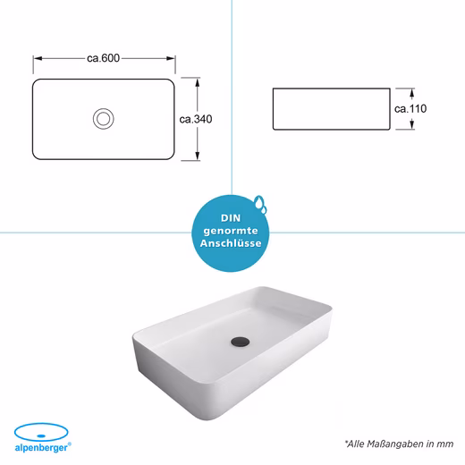- SCOPE OF DELIVERY: Countertop washbasin without tap hole and overflow. WxDxH: approx. 60 x 34 x 11 cm