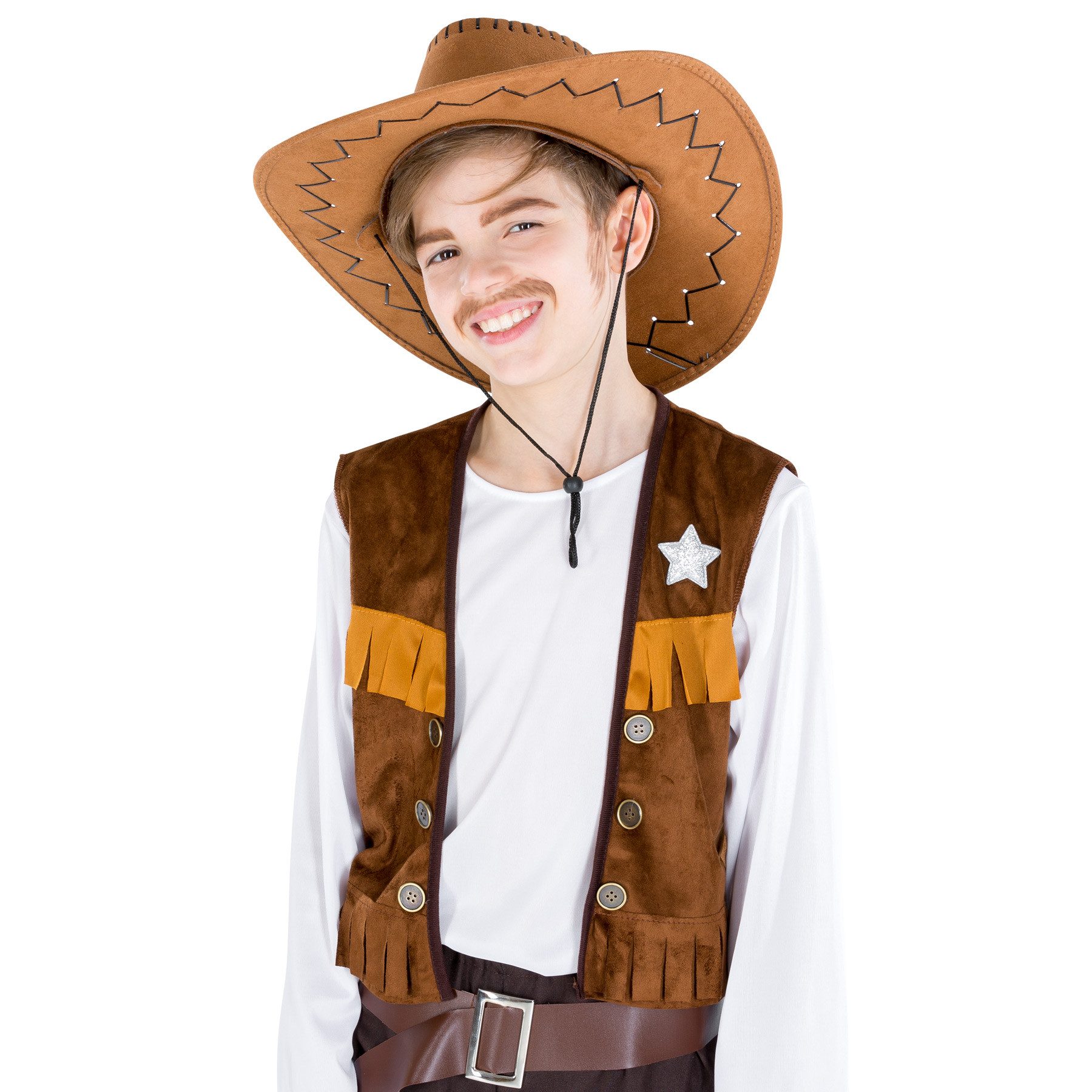 Combined with a cowboy hat, boots, or a toy gun, the look can be customized and made even more impressive. This costume invites children to let their imaginations run wild and experience exciting adventures in the Wild West. Whether as a sheriff, cowboy, or hero – with this outfit, every child becomes a star.