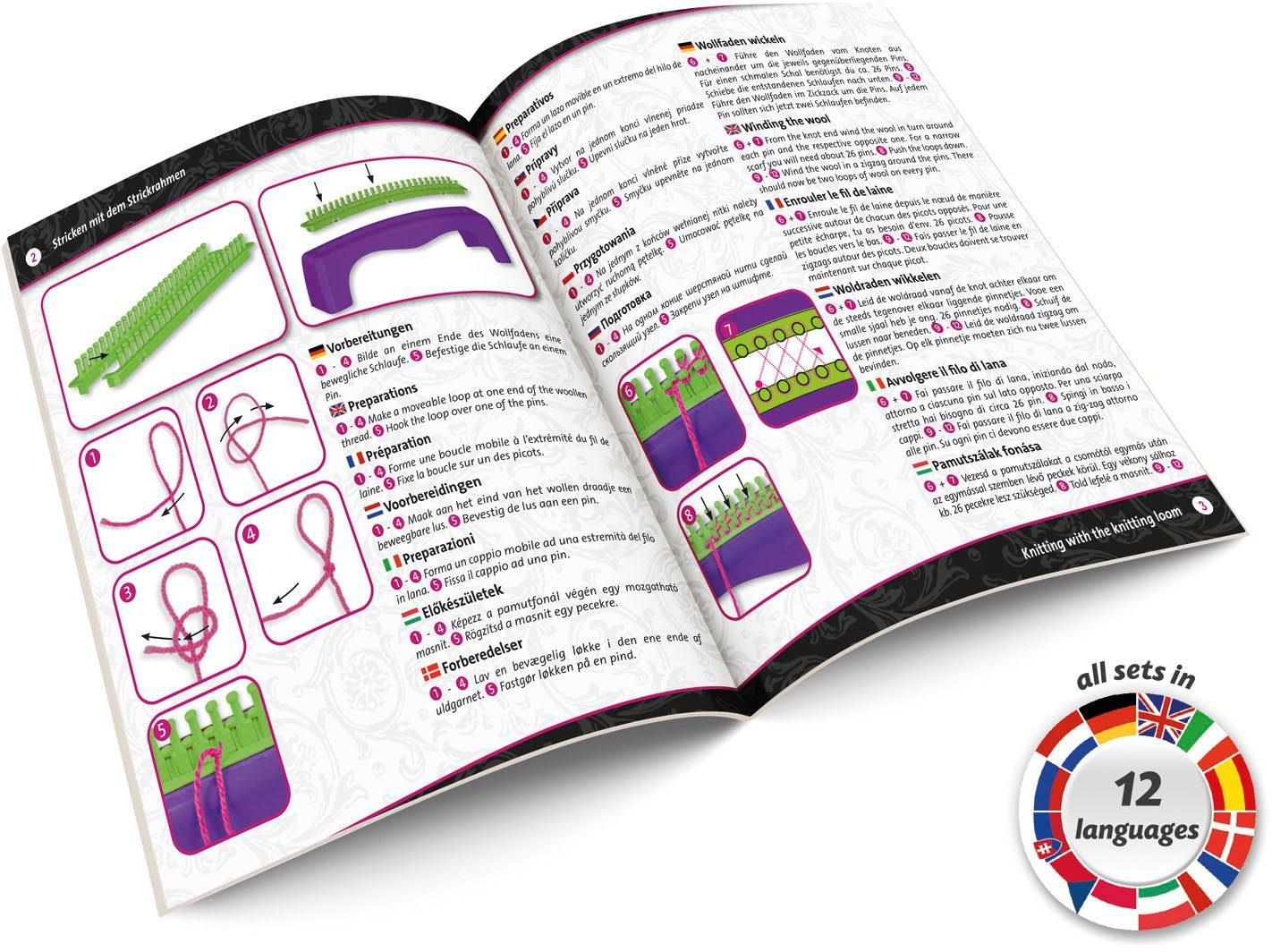 LENA® Knitting Set with Knitting Dolly. Complete set including knitting dolly, knitting bench, knitting hook, plastic needle, and color-coordinated yarn. With detailed, full-color instructions. Suitable for children aged 6 and up.