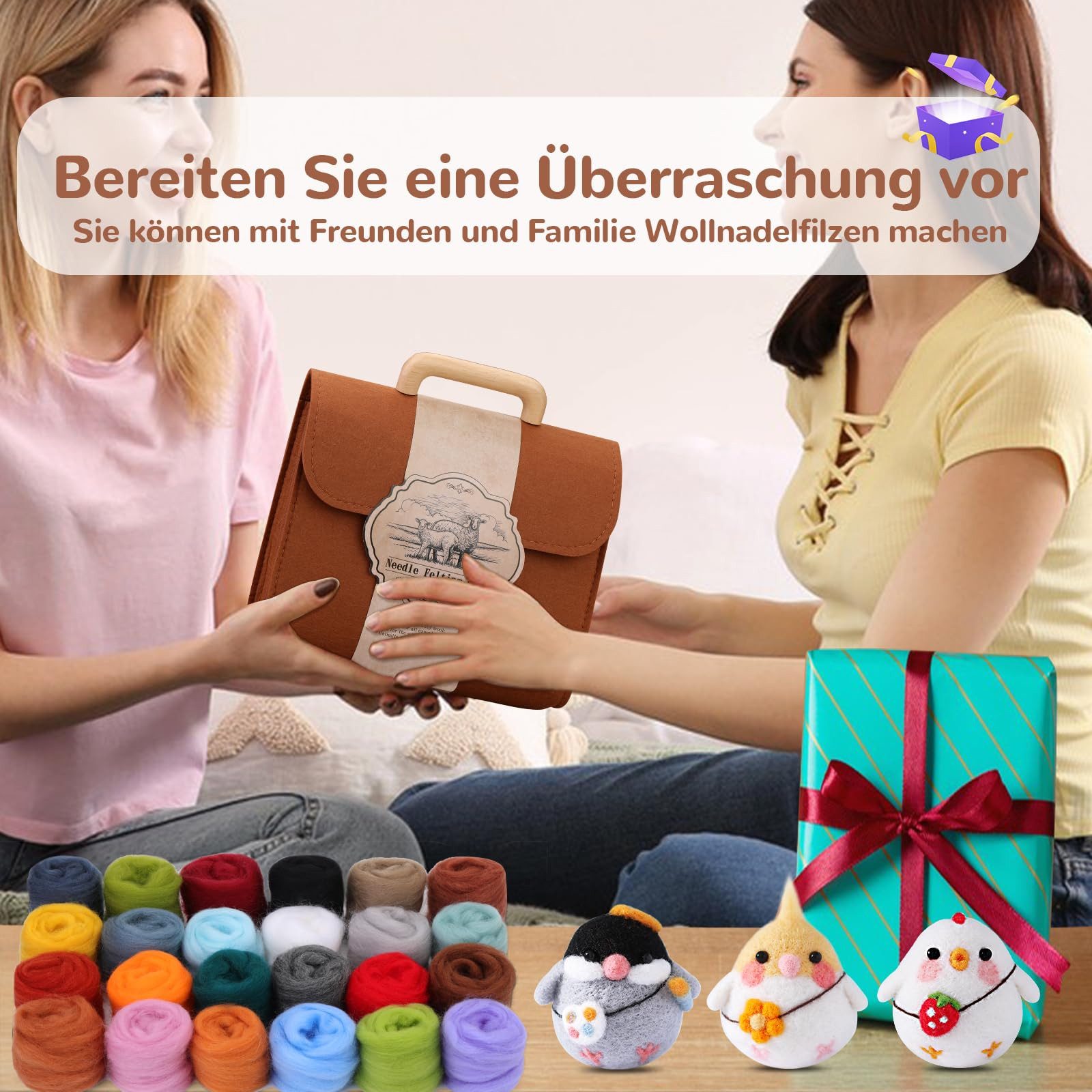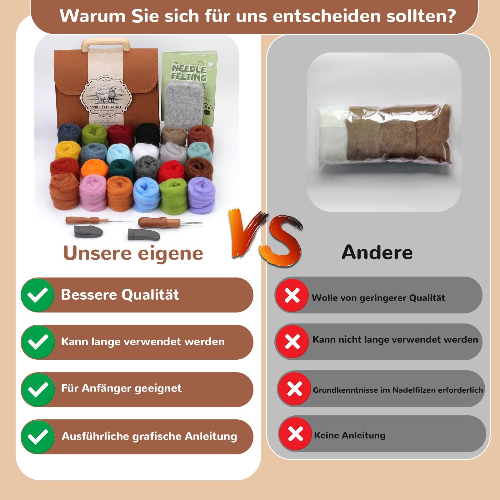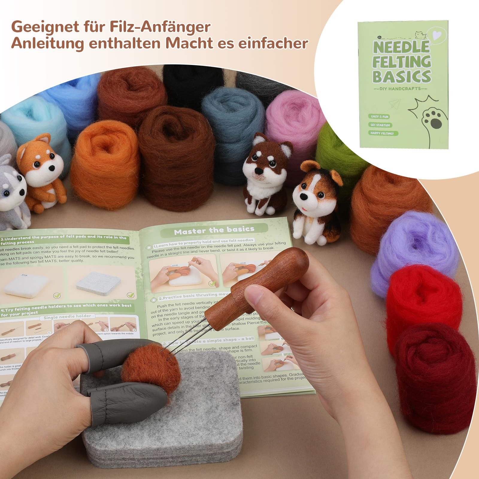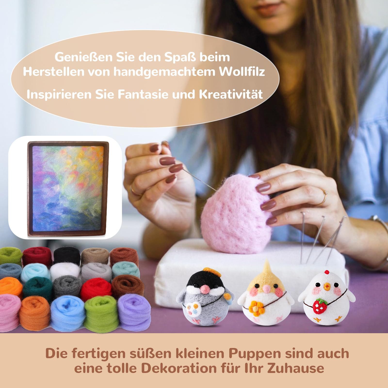 - Complete needle felting set with 24 wool colors, 16 needles, 2 wooden handles, felt cushions, 6 eyes and 3 keychains – everything for your felting projects!