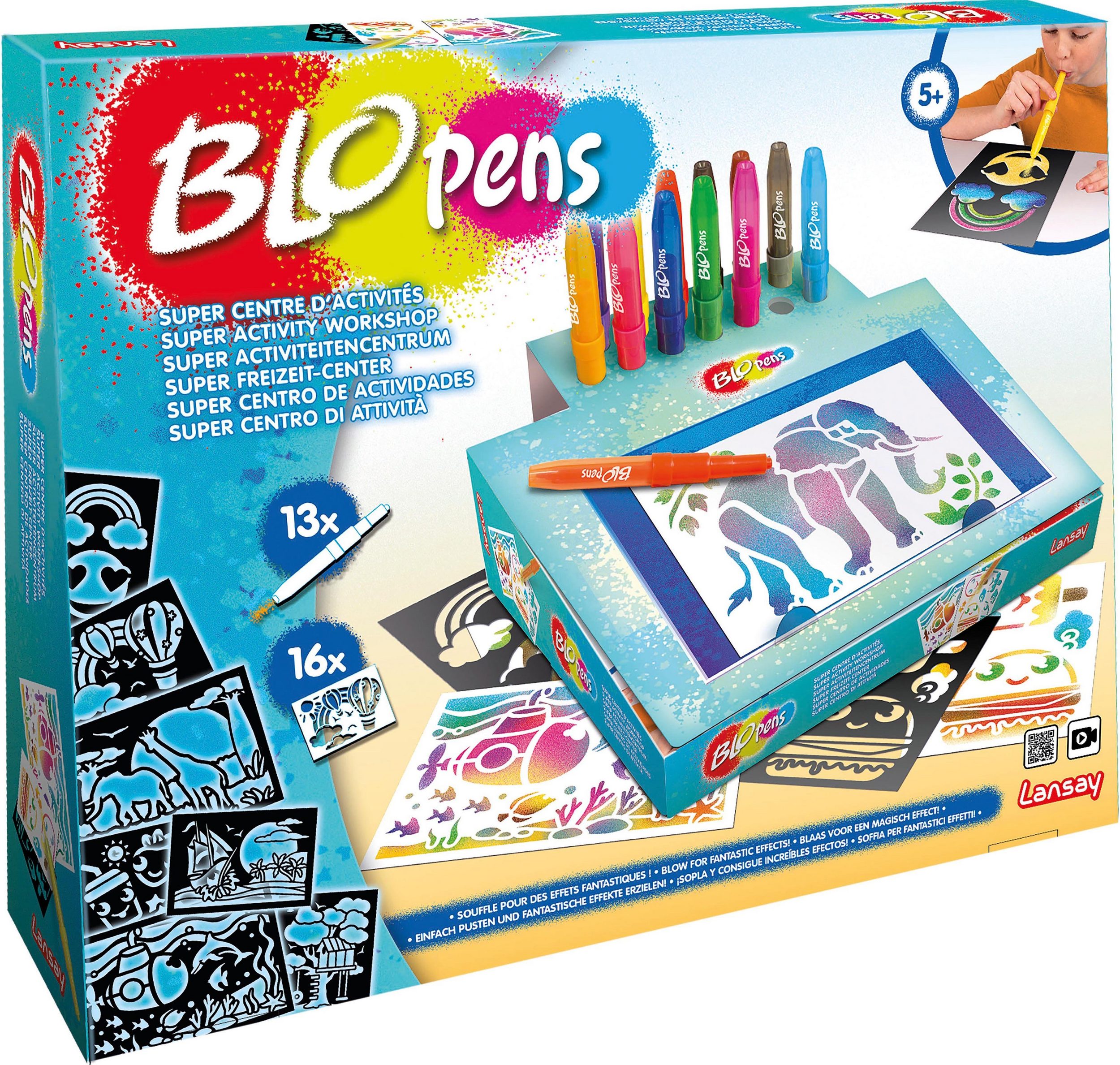 The creative set “Spray Pen Set XL” with magic felt-tip pens! Simply place a stencil on the pen, blow into it, and watch as a picture appears. The pens can also be used as regular markers. In addition to pens in various colors and reusable stencils, the set can be transformed into a “desk” with a pen holder. The 16 different stencils feature motifs such as animals, landscapes, emojis, and many fun drawings.