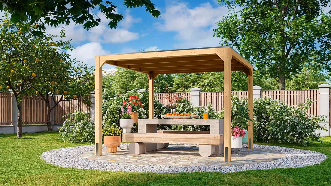 The square pavilion has external dimensions of 320 cm x 320 cm and a roof footprint of 309 cm x 309 cm. The side height is 236 cm, and the ridge height is 239 cm. The attractively designed flat roof is supported by four posts, each 12 cm x 12 cm. The posts and additional rafter crossbeams are pressure-treated, providing excellent protection against the elements. We recommend using our matching 60 cm long H-anchors for securing the pavilion to the ground.