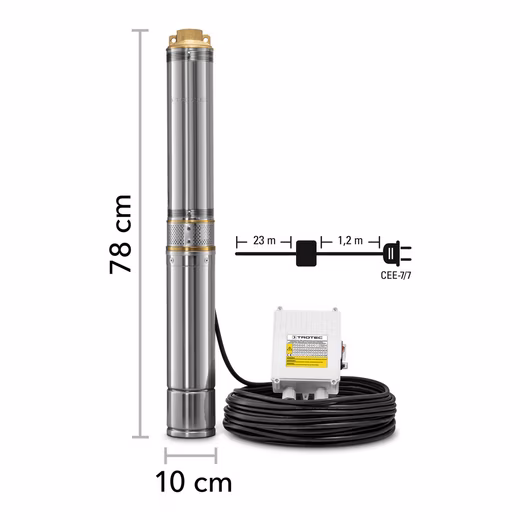 The slim TDP 5500 E deep well pump, made of stainless steel, delivers up to 6,000 liters of usable water per hour from wells, reservoirs, rainwater cisterns, or drainage shafts, thanks to its 1,100 watts of power and a delivery head of 58 meters. Trotec’s deep well pumps are specially designed and highly efficient submersible pressure pumps, whose unique construction and high-quality technology allow them to be used in very narrow boreholes, starting at a diameter of 11 centimeters. For easy pumping from greater depths, the standard equipment includes a 23-meter-long connection cable and suspension eyes for lowering the pump into wells, cisterns, drainage shafts, or similar depressions. With a powerful maximum pressure of 5.8 bar and an immersion depth of up to 20 meters, the TDP 5500 E is optimally equipped. Due to its compact diameter of only 100 mm, the pump is particularly suitable for narrow borehole diameters of 110 mm and above. The TDP 5500 E deep well pump is completely dustproof and waterproof according to protection class IP68. This means the pump can remain permanently in the well even when not in use. Thanks to its IP44 protection rating, the splashproof control box allows for installation in rain-protected outdoor areas.