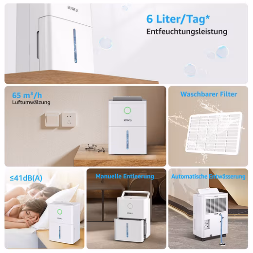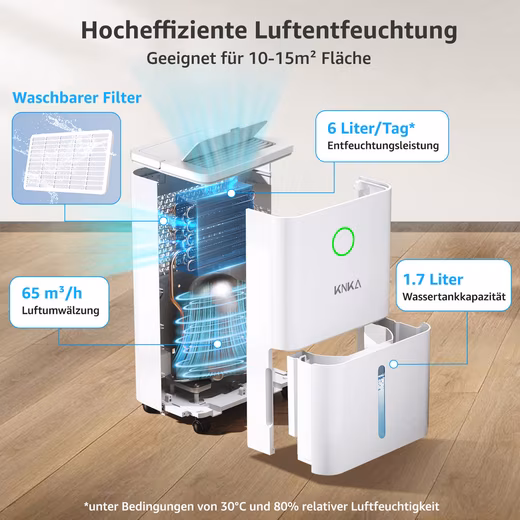 - Effective dehumidification: Removes up to 9 L of moisture per day, 65 m³/h air circulation – improves indoor air quality and effectively protects against mold growth.