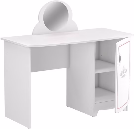 At this desk, all princesses can work with elegance and style. The pink and glittery details give the piece of furniture a delicate girly look that suits any girl’s room. The rounded edges ensure optimal safety. The existing shelf area provides clever storage space and little princesses can make themselves pretty in front of the mirror. Discover the entire collection for a complete princess room. This beautiful desk sets fairytale accents in the world of little princesses. It has a dual function: writing and dressing table. It is functional with 1 cabinet element with shelf adjustable to 3 heights and 1 mirror. Soft, rounded shapes for the safety of the child give the desk its special something. Fronts with water-based paint. Diadem screen-printed motif made of silver-colored sequins, all these are features of this dressing table. The dimensions are 104 cm high x 113 cm wide x 55 cm deep. Structure chipboard 15 mm. 1 door. Interior: 1 floor adjustable to 3 heights. 1 mirror. 1 white plastic handle. Wheelbase 32 mm. Included are easy-to-understand assembly instructions. You only buy the desk here. All other pieces of furniture shown in the last photo can also be purchased from us.