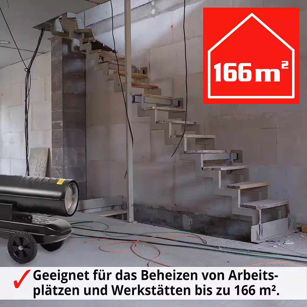 • 20 KW HEATING OUTPUT – Effective and fast heat distribution for areas up to 166 m², ideal for workshops, construction sites and well-ventilated rooms.