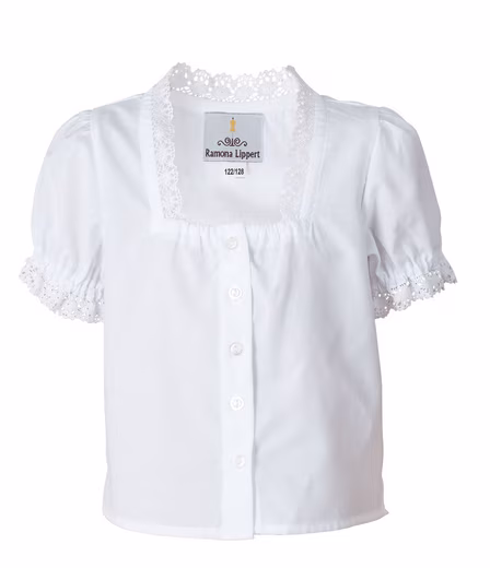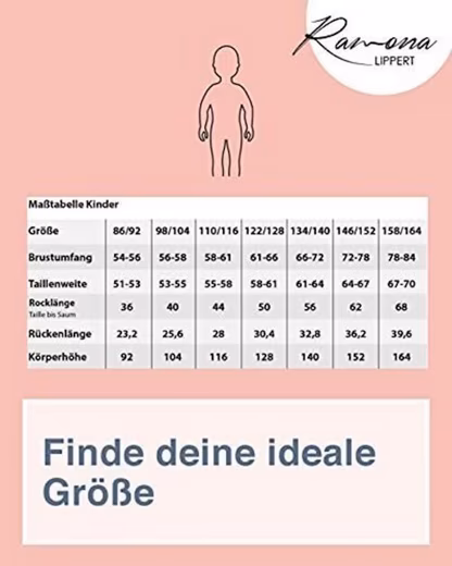 The festive children’s dirndl Anouk inspires with a noble top made of petrol-coloured velvet. The skirt with the floral pattern and the matching cotton apron harmonize perfectly with the strong colour. Included is a white blouse with puff sleeves and lace trim. A practical zipper at the front makes it easy to put on and take off – ideal for children. Whether Oktoberfest, folk festival, wedding or family celebration – with the children’s dirndl Anouk your child is always stylishly dressed.