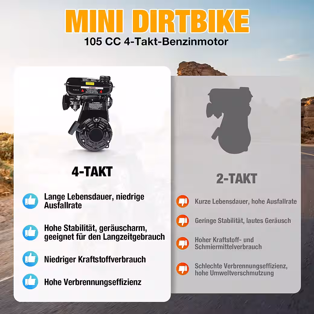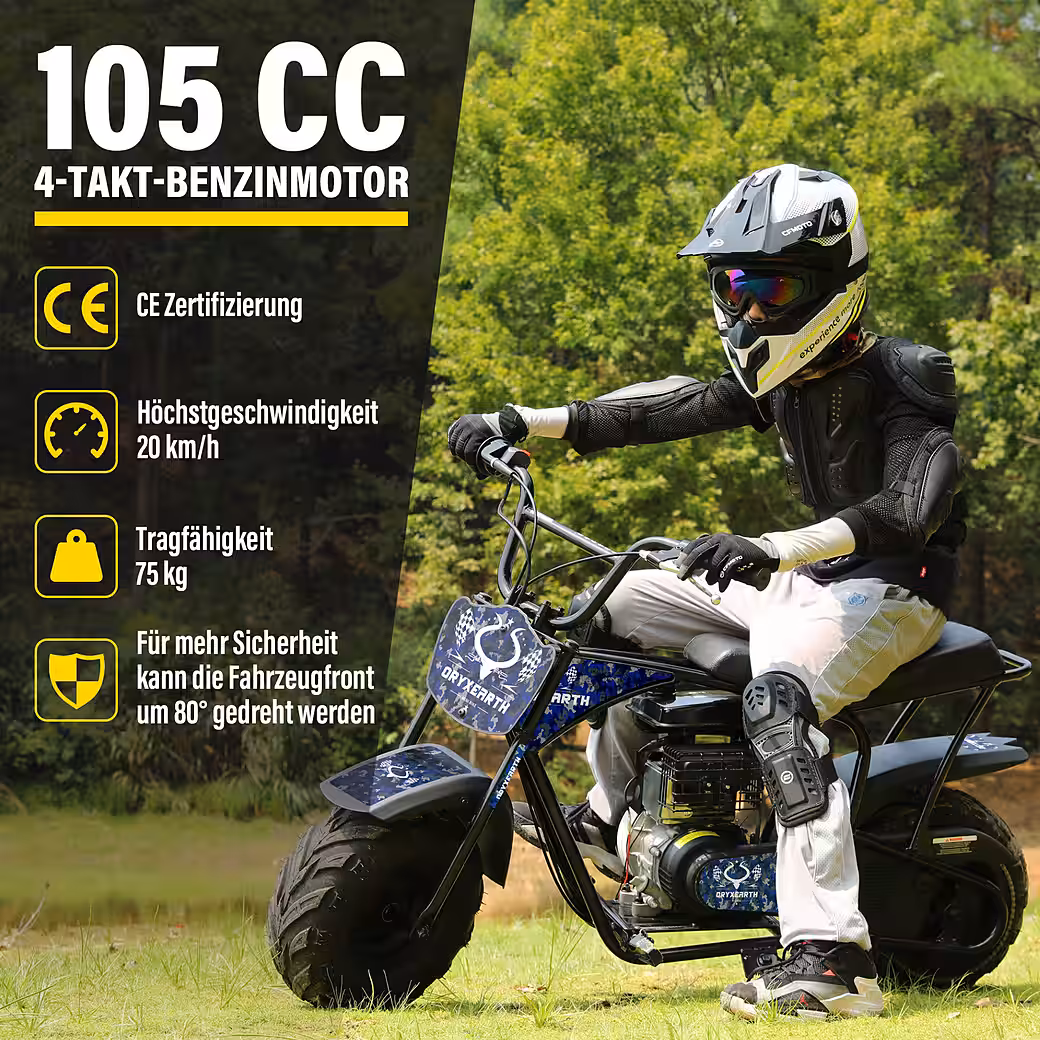 - Powerful performance: The motocross bike features a powerful and efficient 3.5 hp 105 cc 4-stroke engine. By adding gasoline with an octane rating of 87 or higher (without ethanol), you can experience passionate yet safe power
