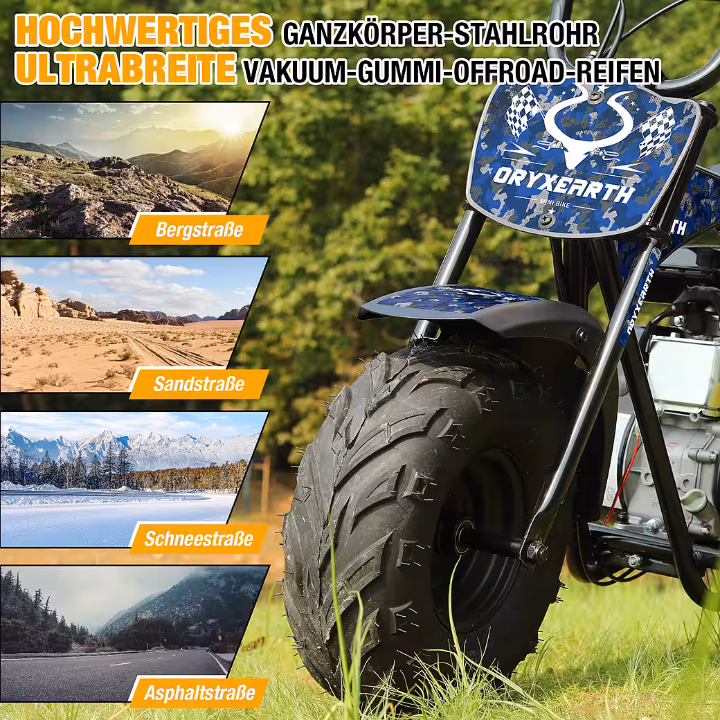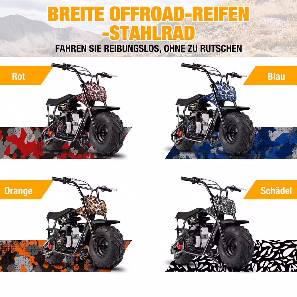 - Simple, smooth, soft, and stable: This petrol-powered motorcycle is designed for easy pull-start operation. Stability is crucial off-road. To ensure a smooth, comfortable ride, we’ve equipped it with wide, all-terrain, low-pressure pneumatic tires, even on rough terrain.