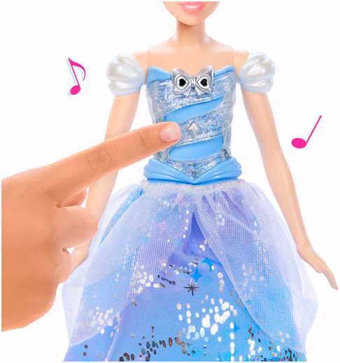 - Inspired by the film character, the posable Cinderella doll also wears a glittering dress with a removable skirt featuring foil accents, a sparkling tiara, and shoes.