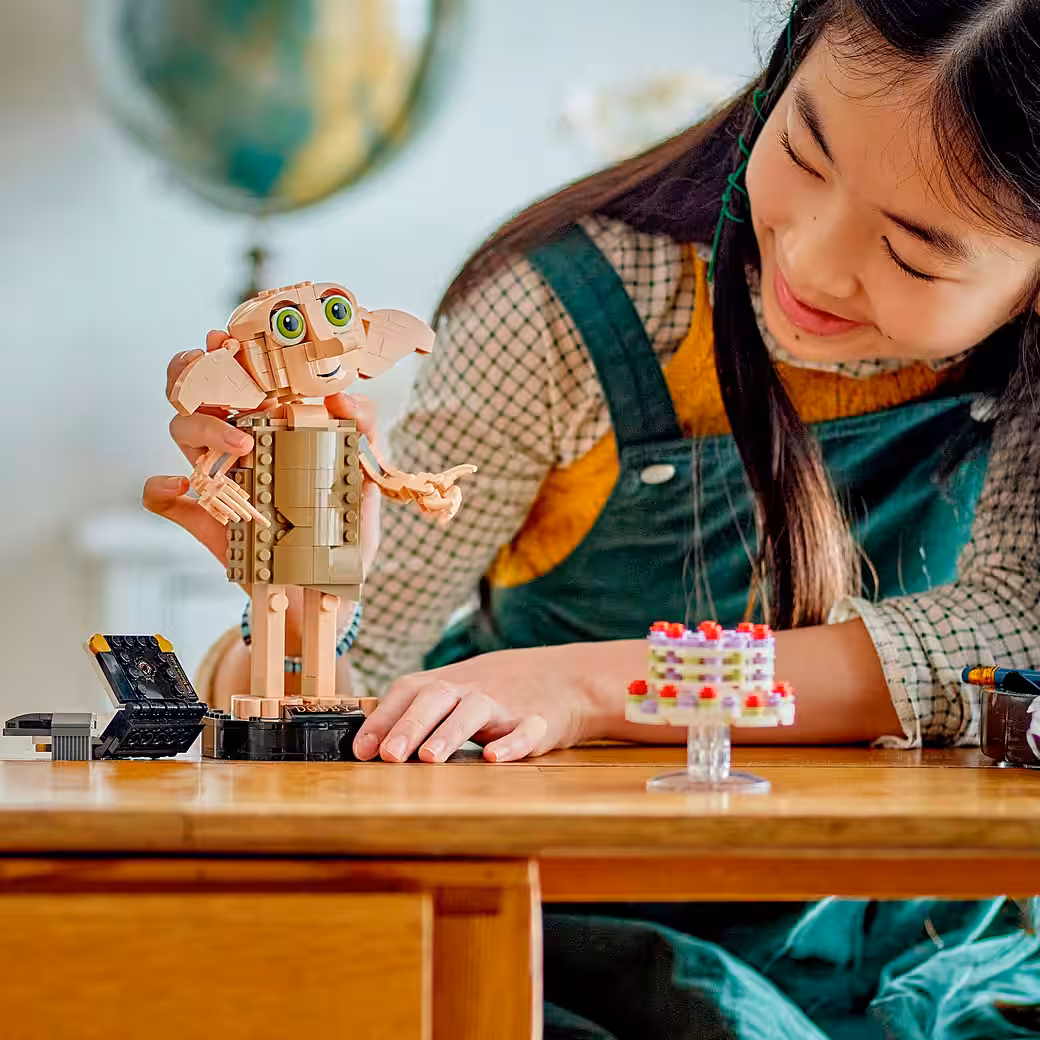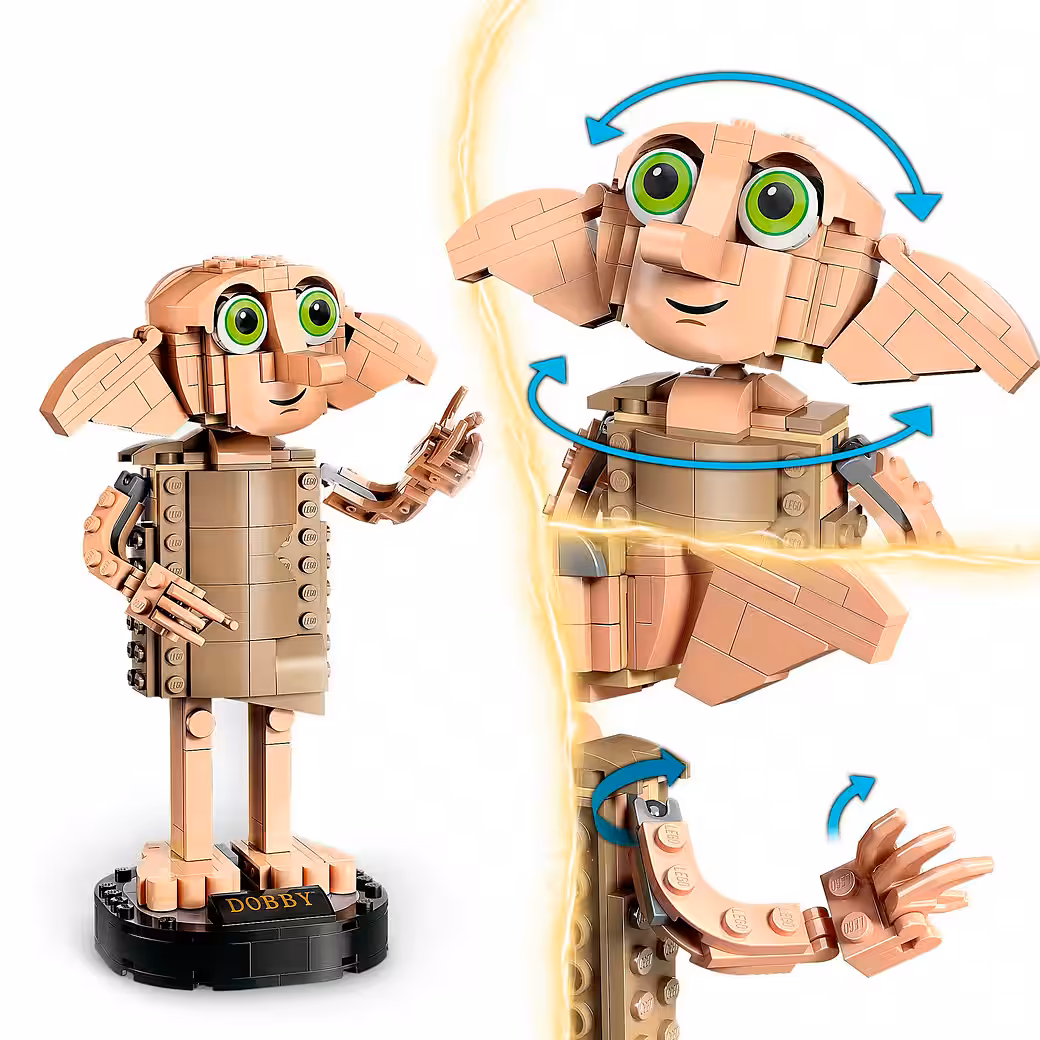 - Dobby’s head, ears, arms, and fingers are movable: Tilt Dobby’s head and move his fingers so he can hold accessories made from LEGO bricks.