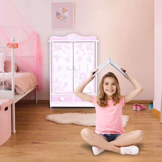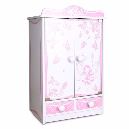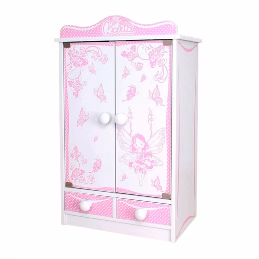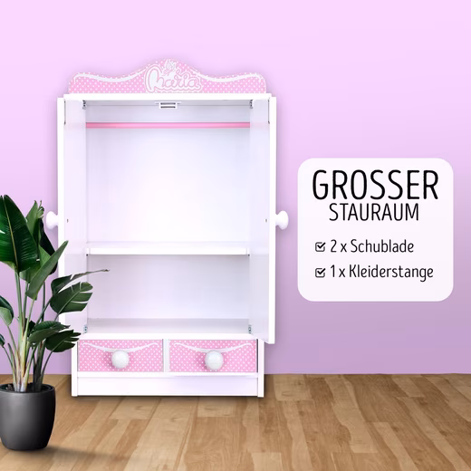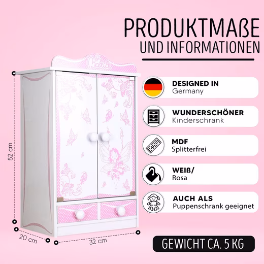 XXL doll cabinet – Beautiful, large & very practical doll cabinet / toddler cabinet incl. clothes rail and a separate compartment for small shoes (adjustable shelf), 2 drawers. You can place the doll’s wardrobe in the room or attach it to a wall (mounting material is not included, device not available) and you can of course also use it as a toddler wardrobe. The height of the cabinet is 52 cm and the width is 32 cm. It is also 20 cm deep. Ideal dimensions for dolls’ clothes, without them being squeezed as usual (as a toddler wardrobe for children up to 3 years). It is made of splinter-proof MDF and weighs 7.0 kg. Finally a cabinet that takes up little space, is cheap and still offers a lot of storage space