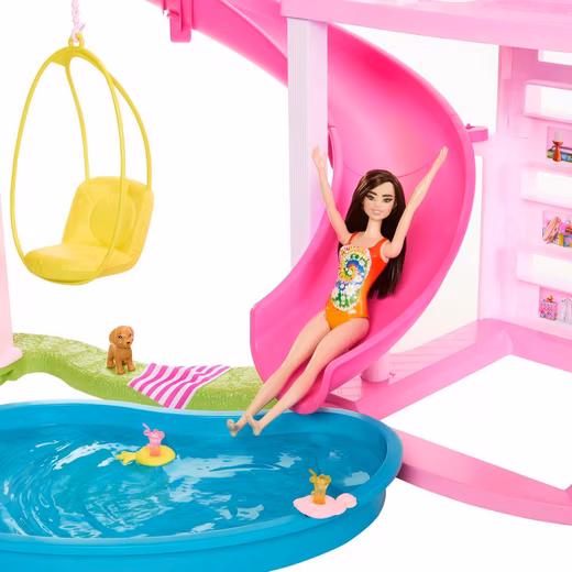 Kids can throw the ultimate pool party with the Barbie Dreamhouse. For endless fun in the sun, this luxury dollhouse has the longest slide yet in the Barbie Dreamhouse series, a spiral slide that winds down three floors. It offers all-around play possibilities with a spacious layout, three floors, and 10 indoor and outdoor play areas. This playset is also more pet-friendly than ever, including a slide for puppies and a pool where furry friends can splash around with Barbie. The bonus room on the top floor can be reconfigured for a sleepover, where four dolls can sleep in the Dreamhouse. With over 75 accessories and reconfigurable areas for double the fun, this is a great gift for children ages 3 and up. Assembly required. Dolls not included. Colors and decorations may vary.