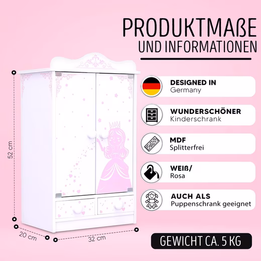 - The height of the cabinet is 52 cm and the width is 32 cm. It is also 20 cm deep. Ideal measurements for the clothing of children up to 5 years old.