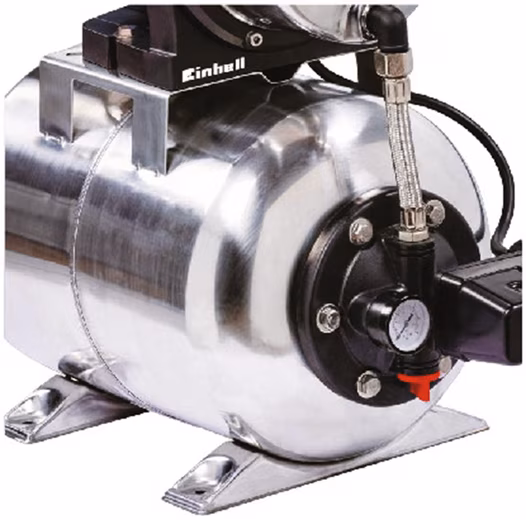 The Einhell GC-WW 1250 NN domestic water supply system is a user-friendly alternative to costly mains water consumption, helping to save money. It’s an efficient solution for pumping clean water from reservoirs, shafts, wells, or cisterns for use within the home and in the garden. The Einhell system consists of a jet pump with an on/off switch and a high-quality stainless steel pump housing. The powerful pump boasts a very high suction force and correspondingly high pressure and flow rate. With its 1,200 W motor, the system delivers up to 5,000 liters per hour. The maintenance-free electric motor is equipped with thermal overload protection. The stainless steel pressure tank has a capacity of 20 liters and features an integrated, easily visible pressure gauge. The domestic water supply system ensures a constant supply of service water for the house or garden, maintained at a constant pressure. The pressure switch automatically regulates pressure differentials. The high-quality mechanical seal ensures a long service life. A separate water filling screw is installed for easy commissioning, and a water drain screw allows for convenient emptying of residual water. The sturdy pump base with mounting holes is easy to install.