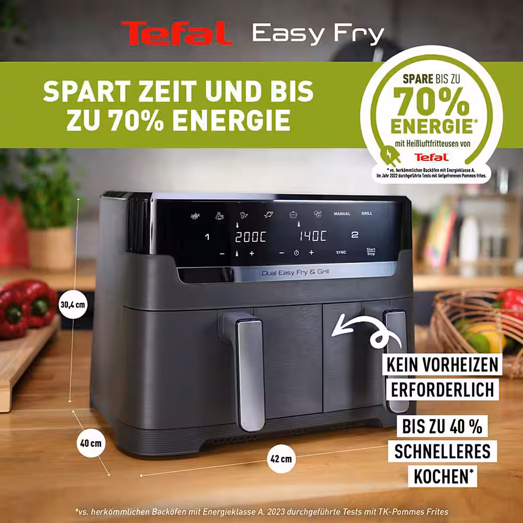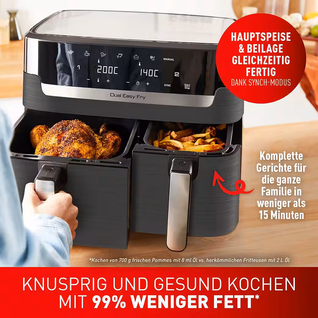 Prepare a complete meal for the whole family in no time – and in perfect time – with the Dual Easy Fry & Grill, the 8.3L dual-chamber air fryer that cooks two different foods simultaneously thanks to its two independent drawers. The XXL drawer accommodates large ingredients like a Sunday roast, while both drawers together can prepare generous portions of fries and more. Thanks to the two independent cooking zones, you can individually set the cooking programs, cooking times, and temperatures in each drawer, creating delicious meals in a flash. The SYNCH function synchronizes the different cooking times, allowing you to serve everything at the same time. With the additional grill function and die-cast grill plate, you can also create tender, juicy meat or vegetable dishes that are grilled to perfection with realistic grill marks and delicious grilled flavor. Grill indoors without smoke or unpleasant odors. The 8 preset cooking programs allow you to fry, roast, bake, and grill food unattended. Simply set it and go for healthy and balanced home cooking! Dual Easy Fry & Grill is 40% faster and up to 70% more energy-efficient than a conventional oven and comes with a free recipe app offering a variety of recipes and daily inspiration, from hearty dishes that are ready in just 15 minutes to extra-healthy ideas based on the appliance’s hot air fryer technology – all at the touch of a button!
