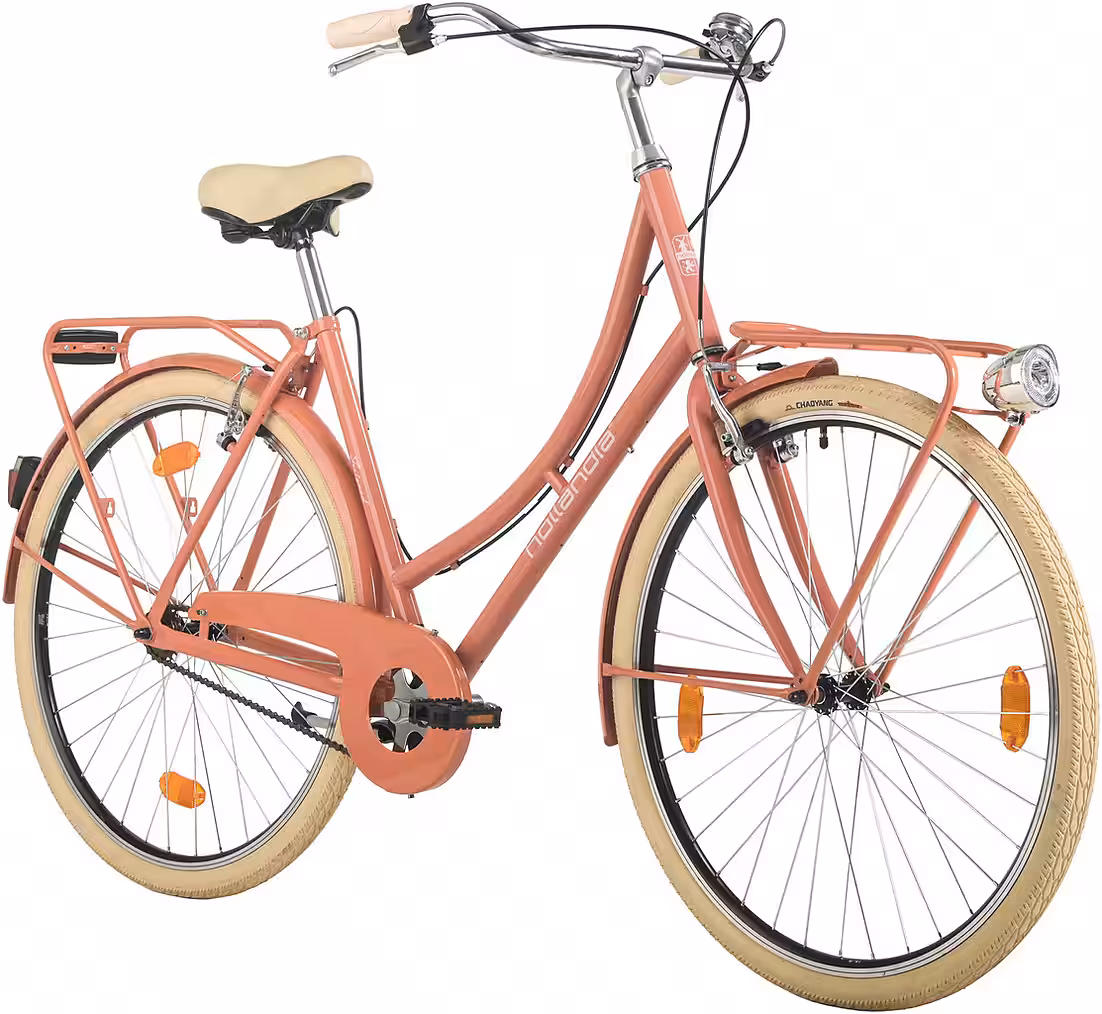 A women’s bicycle that impresses with its charm and cheerfulness: The 28″ women’s city bike FEELGOOD is a classic urban bike. It’s perfect for anyone looking for a reliable, low-maintenance, and uncomplicated city bike. It boasts a minimalist design without sacrificing elegance. Available in fresh peach or mint colors, this bicycle is a real eye-catcher. The beige tires, saddle, and handlebar grips further enhance its sophisticated look. Shopping and other items can be securely carried on the front carrier and rear rack. Battery-powered LED lights ensure you arrive home safely, even in the dark. Recommended height: 160-180 cm
