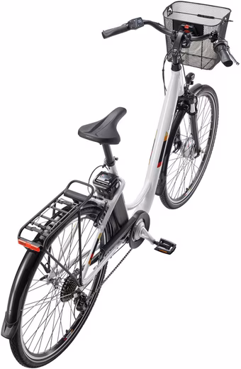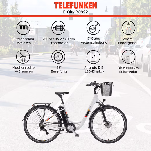 The Telefunken RC822 city pedelec convinces above all with its powerful front motor, which, in combination with the long-lasting battery, enables a range of up to 100 km and thus reliably supports you even on longer distances. The seat tube battery is not only particularly powerful, but also looks less noticeable due to the clever positioning and also improves the handling due to a low center of gravity. The comfortable e-bike is a real all-rounder with the low-step-through frame and the removable shopping basket. With the 7-speed Shimano derailleur, you will find the right gear ratio for every terrain and always reach your destination quickly and relaxed. A modern LCD display provides you with all the important information during the journey, such as speed and the distance travelled. Experience relaxed bike tours thanks to the extensive comfort package consisting of City Comfort saddle, handlebars with ergonomic grips, practical shopping basket and luggage rack.