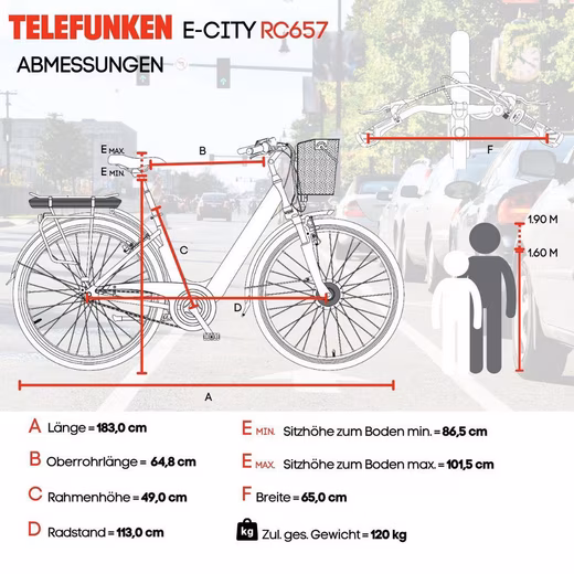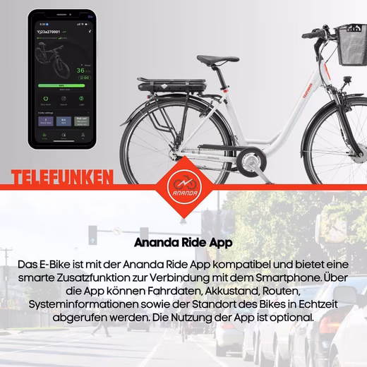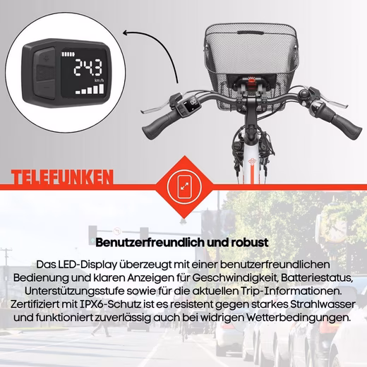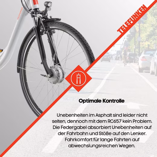 The Telefunken RC657 e-bike is a real all-rounder. Whether in the city, in the country, to work, shopping or for relaxed tours through parks. The city bike provides support in everyday life as well as on long distances. The powerful 250 watt front motor relieves the load on a corresponding incline and guides the pedelec effortlessly to its destination. The 37 volt, 14.5 Ah lithium-ion battery with 536.5 Wh can be removed in a few simple steps, e.g. for charging. Likewise, the practical shopping basket can be quickly converted into a shopping companion and removed. The frame geometry, including the low step-through, increases comfort and ensures a comfortable, upright sitting position. The e-bike is equipped with 28-inch wheels that ensure an optimal balance between stability and speed. The larger wheels of the electric bike allow for better rolling speed and a comfortable ride on asphalt. The clear display shows all important riding data at a glance, including the current speed, the remaining range of the battery and the selected assistance mode. The 7-speed hub gear allows precise gear changes and ensures a pleasant adaptation to changing road conditions. Since the gears are integrated into the rear hub of the bike, they are protected from dirt, water and dust. As a result, hub gears require much less maintenance and are more durable than derailleur gears. The V-brakes provide direct and effective control, which is a great advantage, especially in city traffic. Whether it’s quick stops or unexpected situations, the Telefunken e-bike always ensures a safe ride with this braking system. If you value easy operation and reliable operation in all weathers, you will find a sensible and proven solution in the coaster brake. The suspension on the front wheel effectively absorbs shocks and vibrations, allowing for a noticeably smoother and more pleasant ride – even on uneven roads. The Telefunken all-rounder RC657 is the ideal partner for all those who are looking for a comfortable and practical city e-bike.