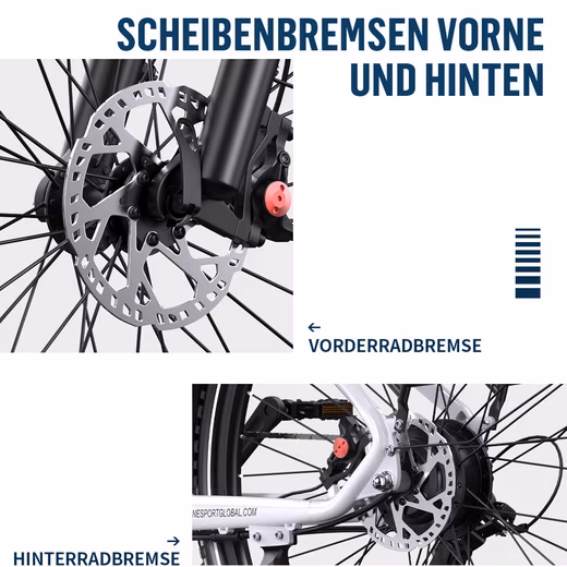 The bike is equipped with disc brakes on the front and rear wheels. They ensure stable braking performance in all weathers, shorten braking distances and increase safety – both at high speeds and on uneven surfaces.