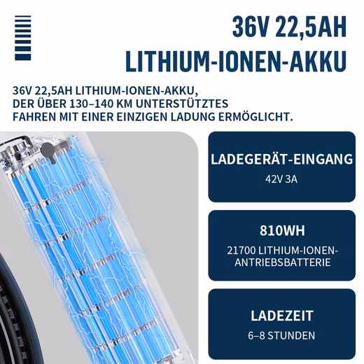 The 36V 22.5Ah lithium-ion battery with 810 Wh enables a range of up to 140 km – ideal for daily rides and long tours. Equipped with high-quality 21700 cells as well as a 42V 3A charging input. The charging time is 6-8 hours.