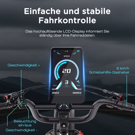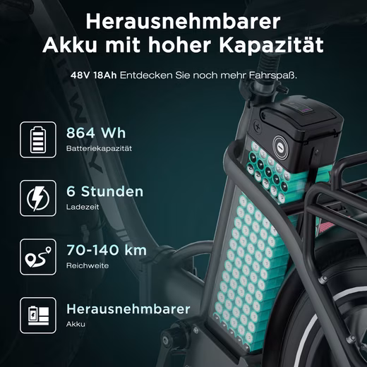 Enjoy unlimited mobility with the high-capacity 48V 18Ah battery. It offers an impressive range of 70-140 km for long commutes or extended tours. The removable battery is quickly fully charged again in just 6 hours – maximum flexibility for daily use.
