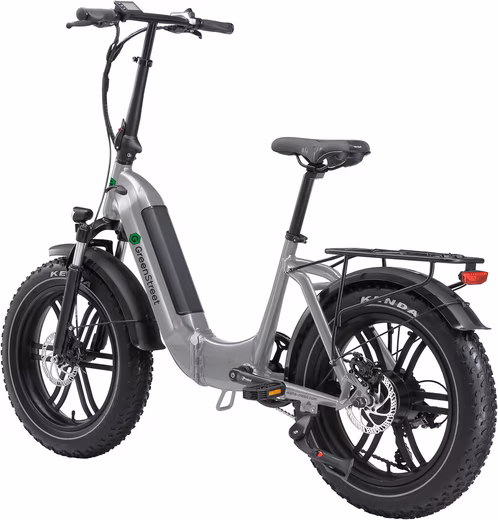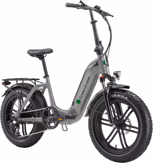 The GreenStreet GS5 step-through e-bike impresses with its stylish design, functionality, and powerful electric motor. This foldable pedelec offers maximum riding comfort thanks to its wide tires. Whether you’re on the coast or in the mountains, it’s the perfect companion! The unique frame design makes getting on and off this electric bike incredibly easy. The folding frame is made of aluminum and can be easily transported in any camper van or car trunk. This e-bike boasts a powerful 250W rear-wheel motor and a range of up to 60 km. To ensure smooth riding on any terrain, the folding bike is equipped with Kenda Fat Tires, an adjustable suspension fork, and disc brakes. The 36V, 10Ah lithium-ion battery is removable and can be fully charged in 5-6 hours using any standard household outlet. The LED lights can be conveniently switched on and off via the display. A bell and a USB port are also included as standard. Consider the possibilities that open up when you’re out and about with the GS5 e-folding bike. Whether commuting to work or planning leisure and travel, the GS5 electric folding bike will be your faithful companion! This step-through e-bike complies with German road traffic regulations (StVZO)!