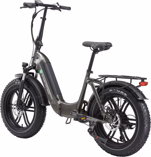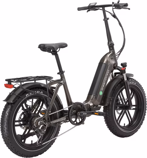 The GS5 folding electric bike from the GreenStreet brand impresses with its looks, functionality and the strength of the electric motor. The pedelec is foldable and offers you maximum riding comfort thanks to the thick tires. Whether on the coast or in the mountains, it is the perfect companion! The special shape of the frame makes it easy to get started on this electric bike. The folding bike has an aluminum frame and can be transported in any camper or van and in most trunks. The e-bike impresses with its 250 W rear-wheel motor and a range of up to 55 km. To ensure that you can make good progress on any surface, the folding bike is equipped with Kenda Fat Tires, an adjustable suspension fork and disc brakes. The 36 V, 10 Ah lithium-ion battery is removable and can be fully charged at any standard household socket in 5-6 hours. The LED lighting can be conveniently switched on and off via the display. Furthermore, a bell and a USB port are included as standard. Think about the possibilities that are available when you are on the road with the GS5 folding e-bike. Be it on the way to work or during leisure and travel, the GS5 electric folding bike will be your faithful companion! The low-entry e-bike is StVZO compliant!