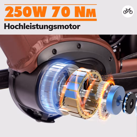 - Powerful 250W mid-drive motor, 70 Nm torque, max. 25 km/h