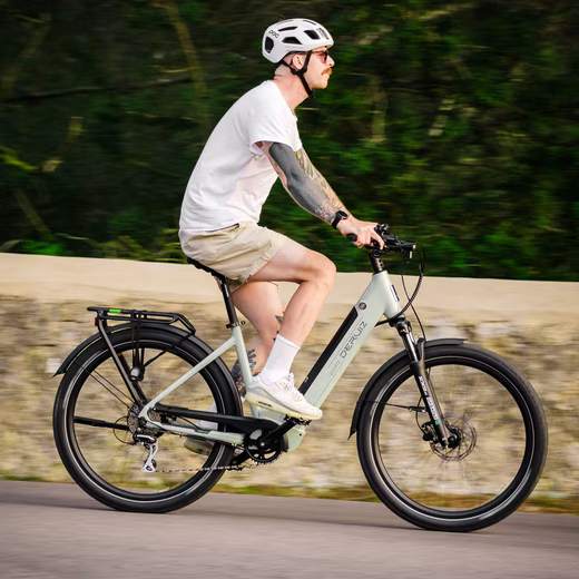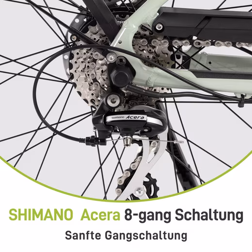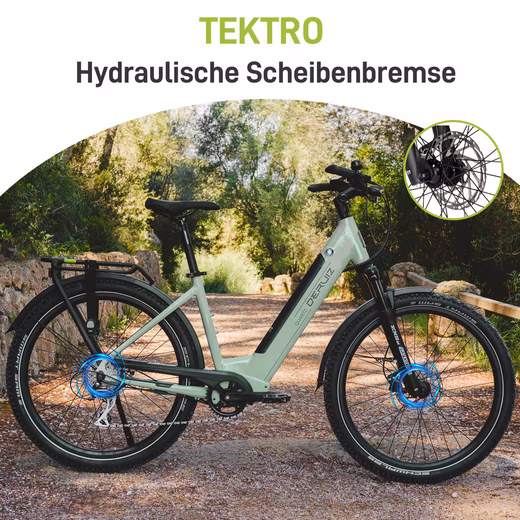 Deruiz Quartz SUV is equipped with a sturdy aluminum frame and features a SHIMANO 8-speed rear derailleur and high-quality TEKTRO hydraulic disc brakes. This guarantees a smooth ride and precise braking. The Suntour fork blends harmoniously into the overall colour concept of the vehicle. The robust suspension system ensures a smooth and comfortable ride on all types of terrain.