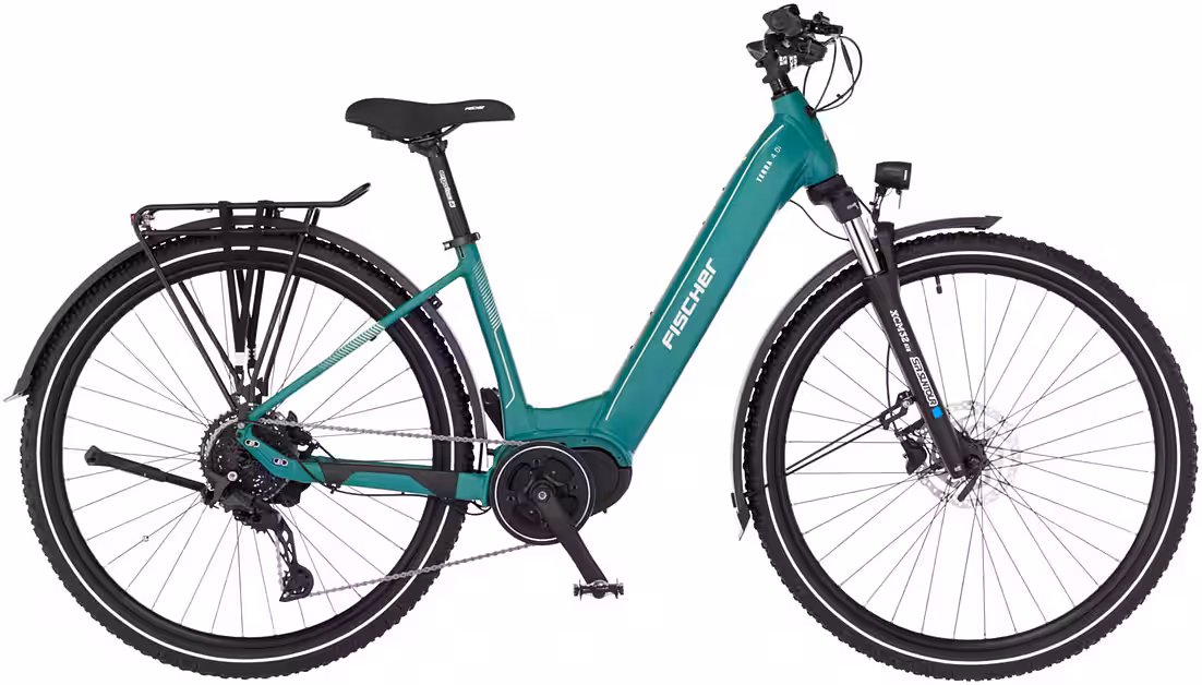 The FISCHER TERRA 4.0i is the ideal choice for anyone seeking sporty performance and robust components for trail rides and tours. Powerful hydraulic disc brakes ensure reliable control, while the stable Humpert ergotec seatpost and ergonomic Ergon saddle offer exceptional comfort, even on longer journeys. The high-quality SR SUNTOUR XCM32 ATB suspension fork smoothly absorbs bumps and, together with the precise SHIMANO 10-speed CUES drivetrain, guarantees dynamic handling – perfect for varied terrain. The fully integrated 630 Wh battery is elegantly integrated into the frame, well-protected yet easily removable. With a range of up to 150 km, you’re well-equipped for extended tours. The powerful Bafang M400 mid-drive motor with 80 Nm of torque provides the necessary power for challenging routes. The large Bafang LCD 1050 CAN bus display allows you to intuitively control the support levels and keep track of all important riding data. With a 24-month warranty on the integrated battery and a sporty, distinctive design, the TERRA 4.0i is your reliable partner for every adventure.