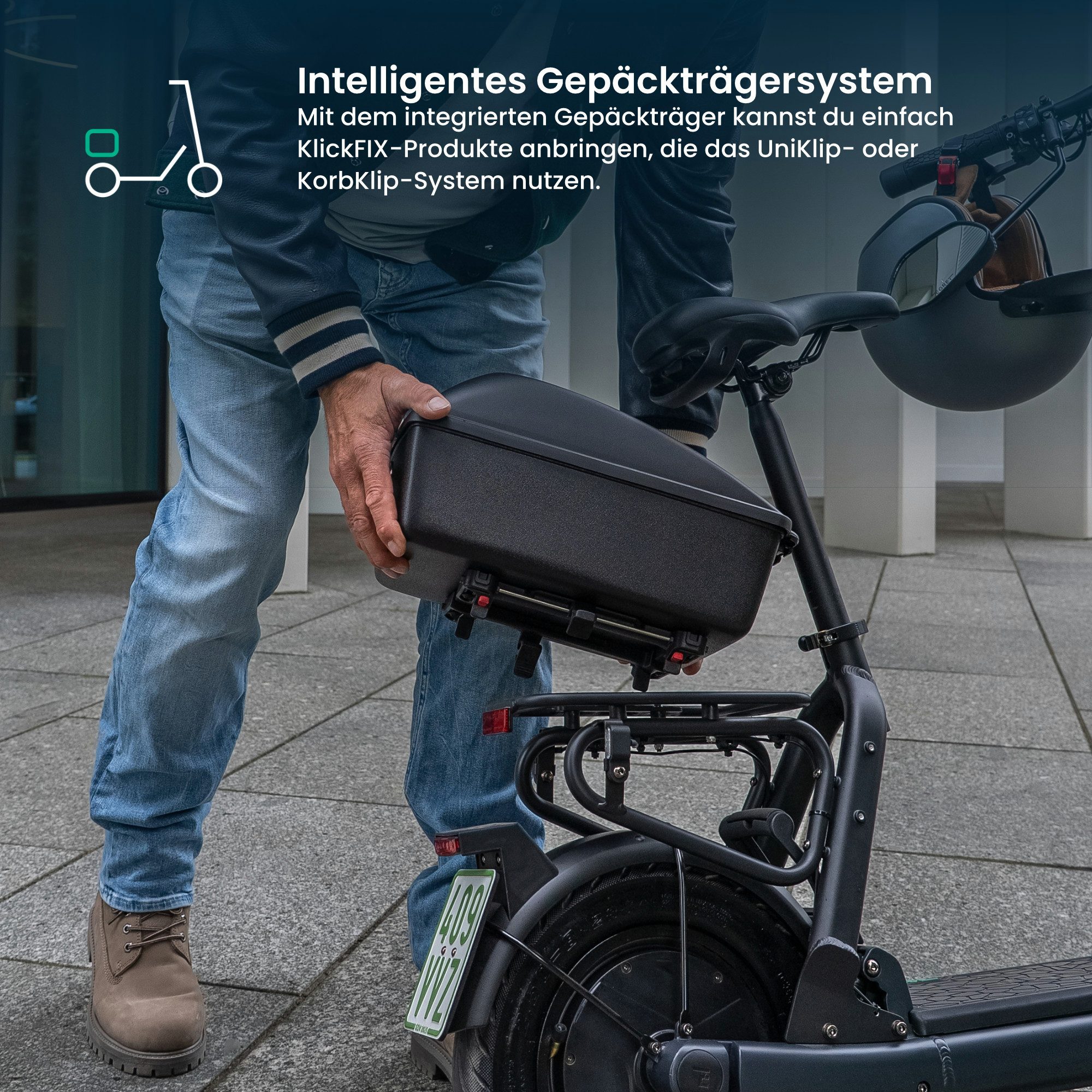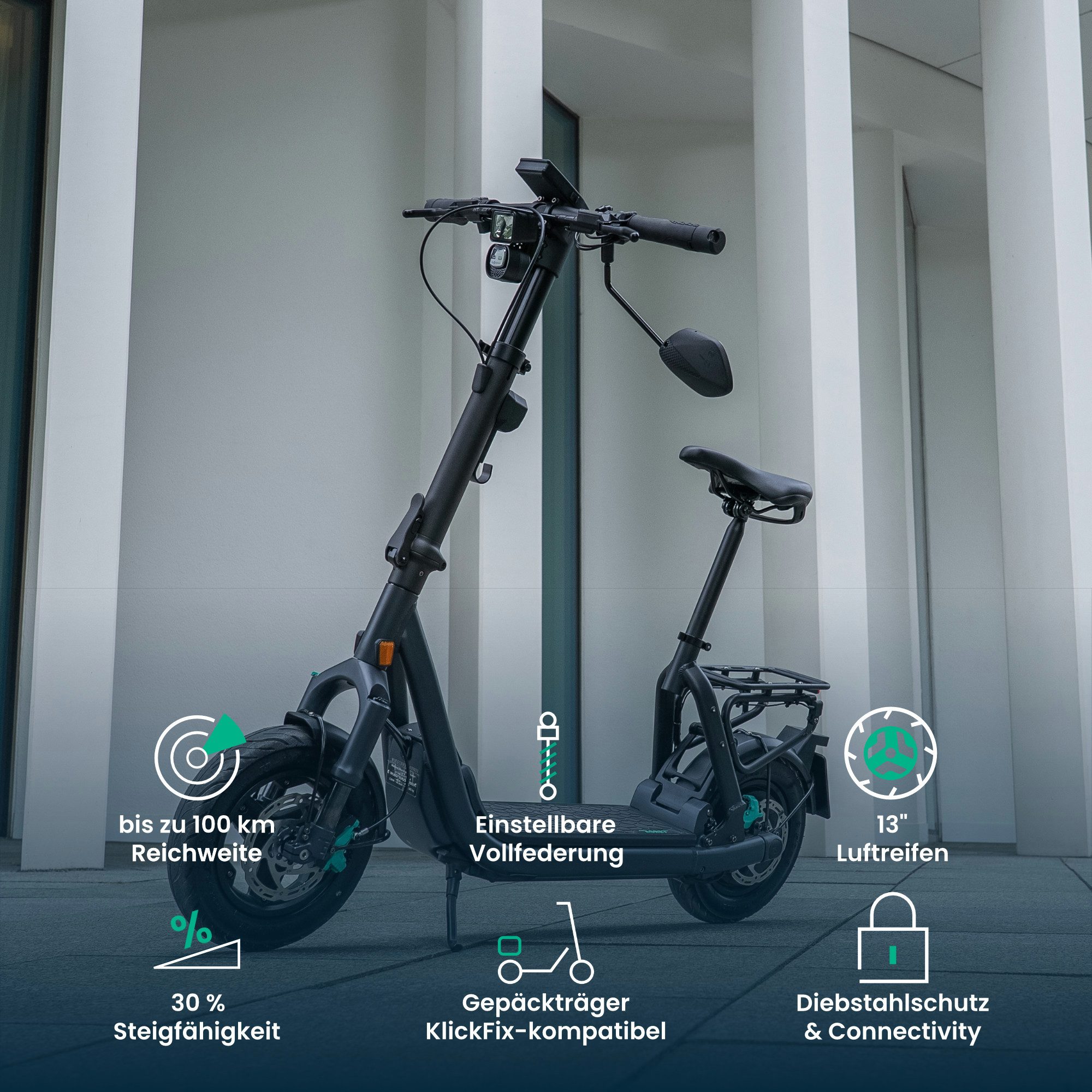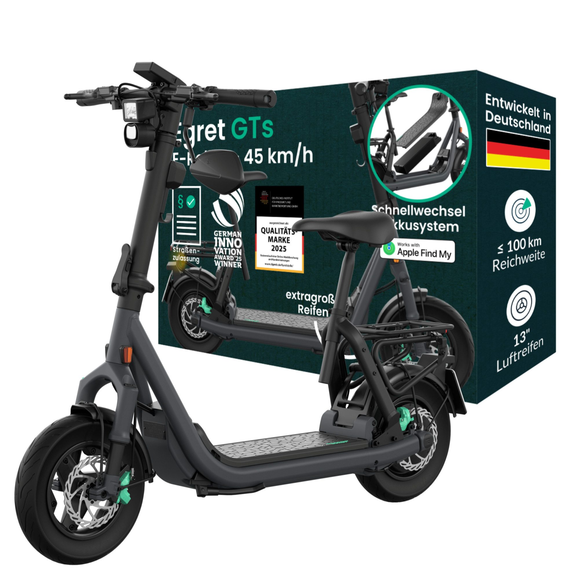 The Egret GTs redefines urban mobility: compact like an e-scooter, fast like a moped, and comfortable like an e-bike. With road approval (L1e), a top speed of up to 45 km/h, and powerful performance, it’s perfect for commuting, leisure, and longer trips outside the city. At its heart is a powerful electric motor with 1,000 W continuous power and up to 1,890 W peak power—typical moped performance, compactly packaged. This allows the GTs to accelerate effortlessly and tackle inclines with ease. Combined with a quick-swap battery system and a capacity of 48 V / 20 Ah (949 Wh), the scooter offers an impressive range of up to 100 km—ideal for daily commutes or weekend getaways. The ride comfort is significantly above average: Large 13″ pneumatic tires with puncture protection, full front and rear suspension—an upside-down fork at the front and an adjustable coilover suspension at the rear—make cobblestones, potholes, or uneven roads no problem. Whether you’re sitting or standing, the GTs rolls smoothly and safely. Conveniently, the GTs is foldable and compact enough to fit in a car or camper van trunk—a real advantage if you want to be flexible on the road. The removable battery also makes charging easy, even when there’s no power outlet nearby. Features and safety are top-notch: Hydraulic 4-piston disc brakes ensure reliable stopping power, while LED lights, turn signals, and an integrated electronic immobilizer offer comfort and security—whether in city traffic or on longer journeys.